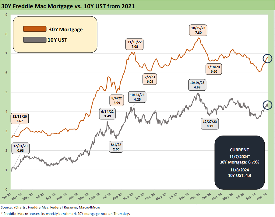 The above time series plots the 10Y UST vs. the Freddie Mac 30Y Mortgage Benchmark with the rate ticking higher this week on the Freddie mortgages to 6.79% from 6.72%. We were close to 6.0% in late Sept, so the good economic news has been the driver of rates that further undermines housing affordability. Tariffs on supplier chains will not help construction costs. We will not get a chance to test the theory that Harris was working on with respect to how to address supply, so we can just wait for how Team Trump will seek to address the supply challenge.