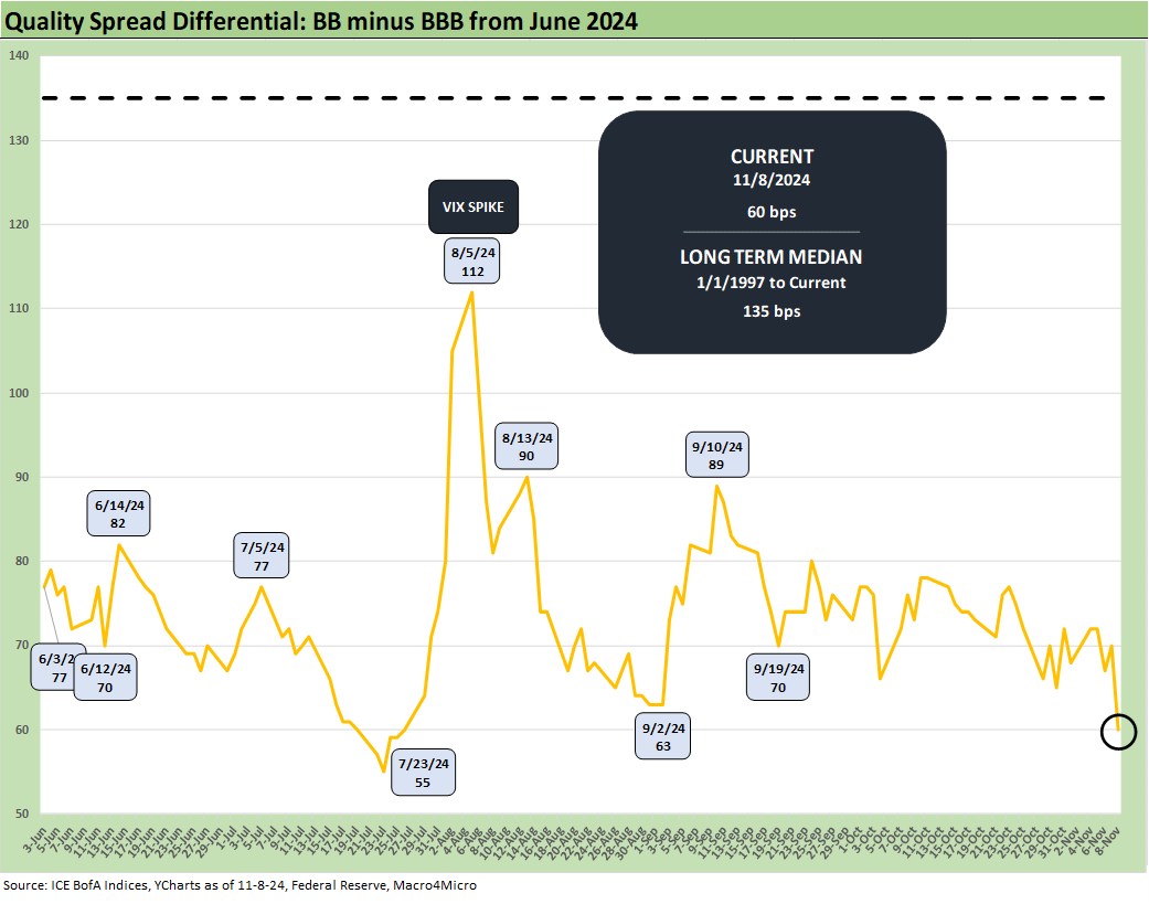 The “BB OAS minus BBB OAS” differential shows that the middle tier quality spread differential is -8 bps lower on the week to +60 bps vs. the long-term median of +135 bps.