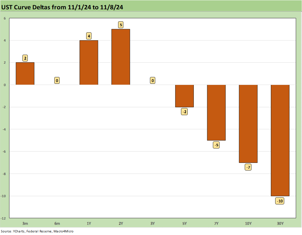 The UST was jumpy ahead of, during, and after the election with the 10Y UST running up by +16 bps when it was clear Trump was getting the brass ring. This past week saw an FOMC meeting as almost a minor sidelight, and the -25 bps FOMC easing came along with a tone that signaled more to come. We will get fresh CPI and PPI numbers this week.