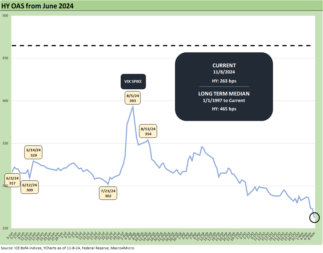 The post-election asset performance drove a great week in one of those “buy’em all now, sort’em out later” moments that showed all 11 S&P 500 sectors in the green, the NASDAQ at +5.7%, a monster rally in small caps at a dazzling +8.6%, and another tightening wave in HY spreads to June 2007 levels (see HY OAS Lows Memory Lane: 2024, 2007, and 1997 10-8-24).