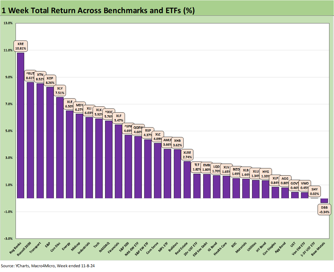 The only Mag 7 heavy line item in the top quartile is Consumer Discretionary (XLY) on the back of another banner week of the always volatile Tesla at +29%. The sense that Elon Musk is Trump’s kindred spirit (or his Rasputin?) is spilling into Tesla stock in part on the idea that Musk can leverage the massive conflicts of interest that get no shortage of headlines. The issue around what is in store for Tesla’s aspiring competitors in EVs and the Biden era incentives will be one of many topics.