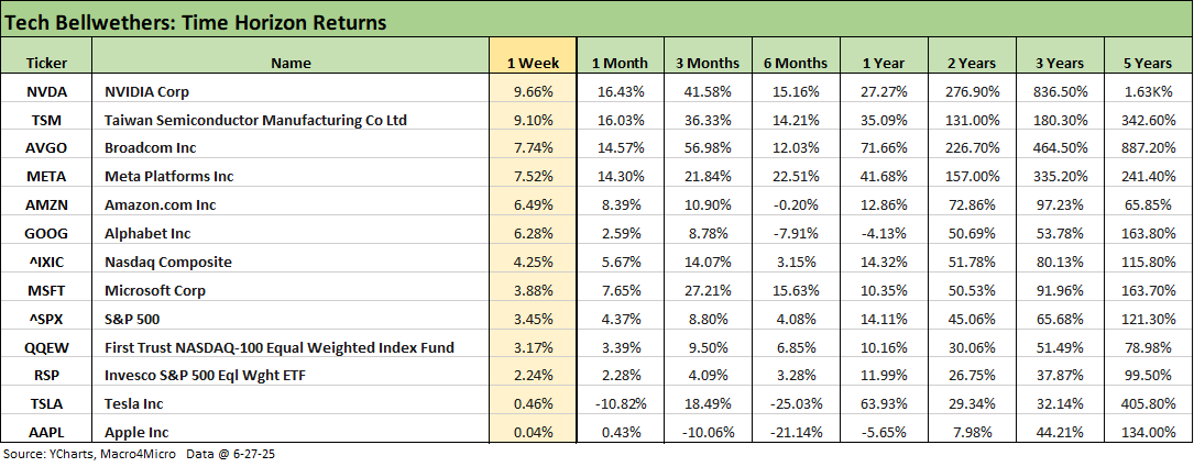 The above chart updates the tech bellwethers with an all-positive week with chips leading the pack. Tesla and Apple are the weakest and most volatile during 2025.