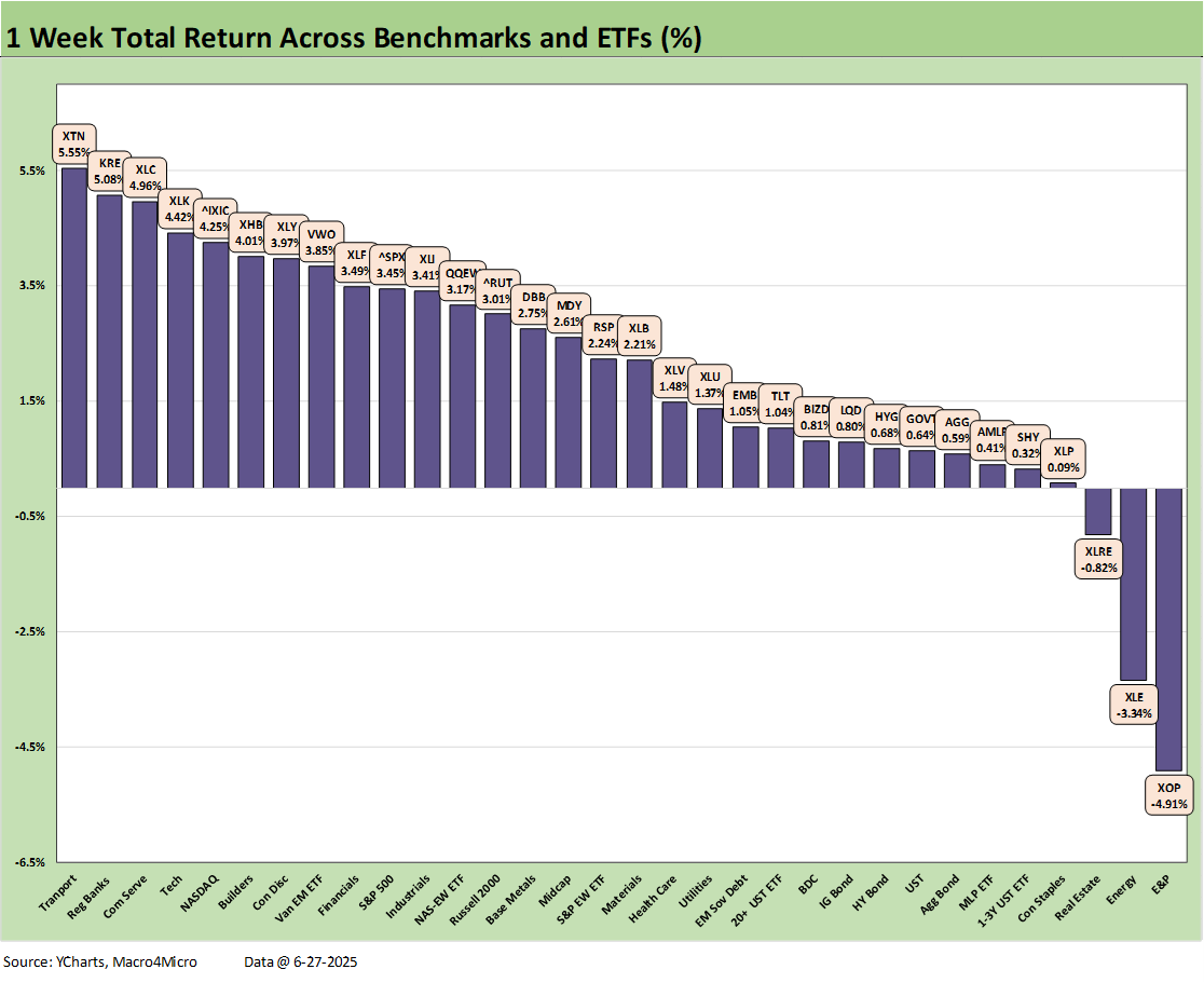 The top quartile was led by Transports (XTN) at #1 just ahead of Regional Banks (KRE) at #2 followed by Communications Services (XLC) and Tech (XLK) followed by NASDAQ to round out the top 5. Oil quickly moved away from the Strait of Hormuz worries and stood out as two negative outliers for E&P (XOP) and Energy (XLE). Oil (WTI) still closed Friday $5 above where it was at the end of May.