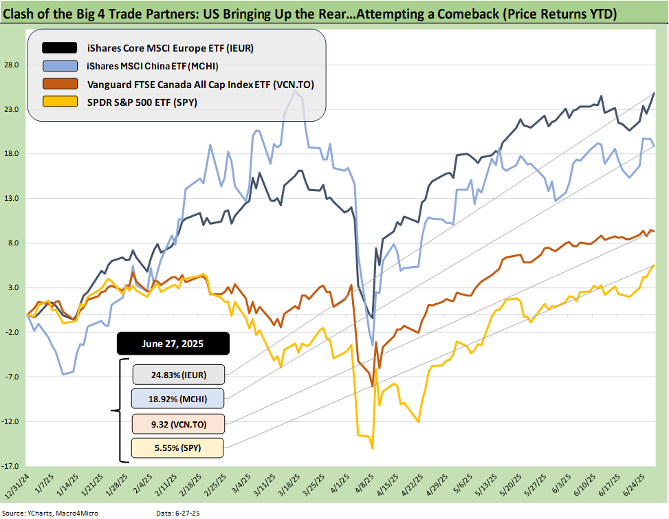 Trump ended the week by renewing his attack on Canada, so tariffs will get back on the front burner very quickly and especially with the pause period ending (in theory). Team Trump has locked in on Canada since Day 1 and the most recent aggression in steel and aluminum was harsh (see Tariffs: Testing Trade Partner Mettle 6-3-25). We have looked at Canadian issues in detail in past commentaries (see Trade Exposure: US-Canada Import/Export Mix 2024 2-7-25).