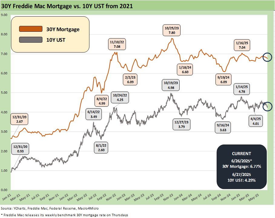 The “consumer watch” had a rough week with sharp revisions down for PCE in the final estimate for 1Q25 GDP, and that news had company with negative PCE release numbers for both personal income and consumption in May. Even if noisy at the headline level, 1Q25 GDP and monthly releases show the economy slowing and notably at the consumer level (see PCE May 2025: Personal Income and Outlays 6-27-25, 1Q25 GDP: Final Estimate, Consumer Fade 6-26-25).