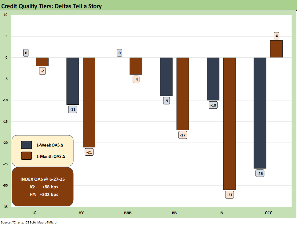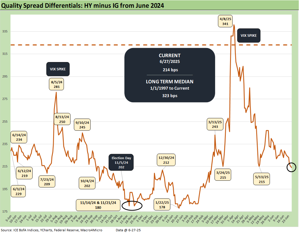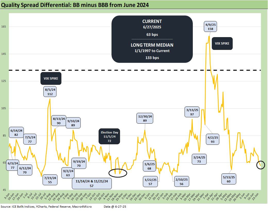 The above chart updates the “BB OAS minus BBB OAS” quality spread differential. We see a -9 bps compression on the -9 bps move tighter in the BB tier and no action in the BBB tier. The +63 bps is within shouting distance of the +55 bps low of July 2024.