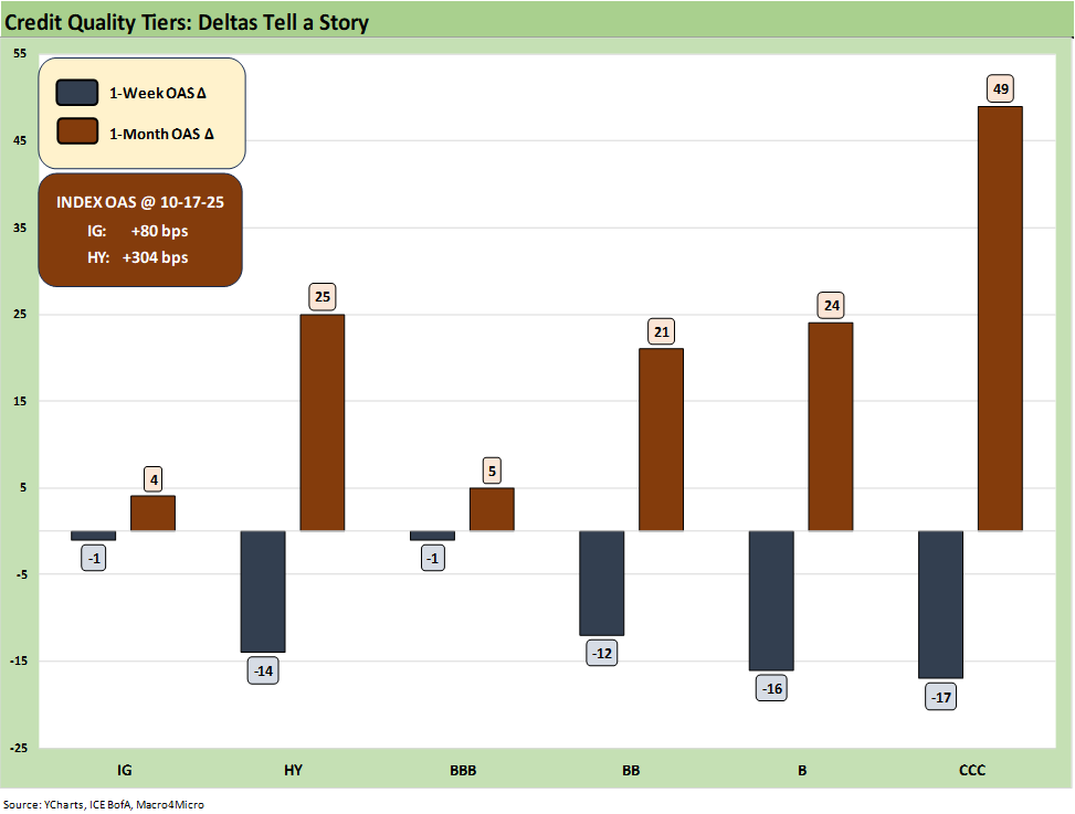 The above chart updates the rolling 1-week and 1-month OAS deltas for IG and HY and the credit tiers from BBB tier down to CCC. After a material widening last week, the credit benchmarks had an easy starting point with HY moving -14 bps tighter after moving +38 bps wider last week. The rolling 1-month for HY is now +25 bps wider at +305 bps, which is at least above the June 2007 HY OAS band. At +80 bps, IG OAS remains consistent with past credit cycle lows.