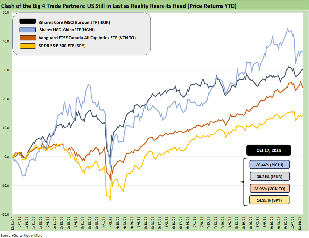 The above updates the YTD returns for some bellwether index ETFs for the Big 4 developed market trading partners – the US, Europe, China, and Canada. The aim of the chart is to plot some ETFs that tell some market stories for US investors thinking about global diversification. These ETFs are just a useful sample that uses relevant broad market indexes for each region as snapshots.