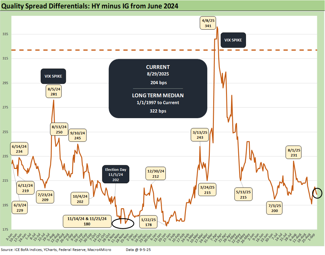 The above chart updates the quality spread differentials for HY vs. IG with “HY OAS minus IG OAS” +2 bps wider on the week to +204 bps with HY +1 bps wider and IG -1 bps tighter.