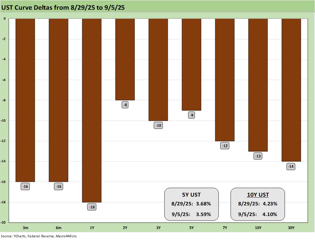 The above chart details a bullish week for bonds from short to long with Friday dominating the action on a lousy jobs report. Jobs were arguably worse than Fed and market expectations, and the setbacks could get more debates going around the FOMC delivering more than two cuts in the home stretch and especially if SCOTUS holds up the IEEPA ruling and some of the concerns around tariff-related price pressures could be mitigated.