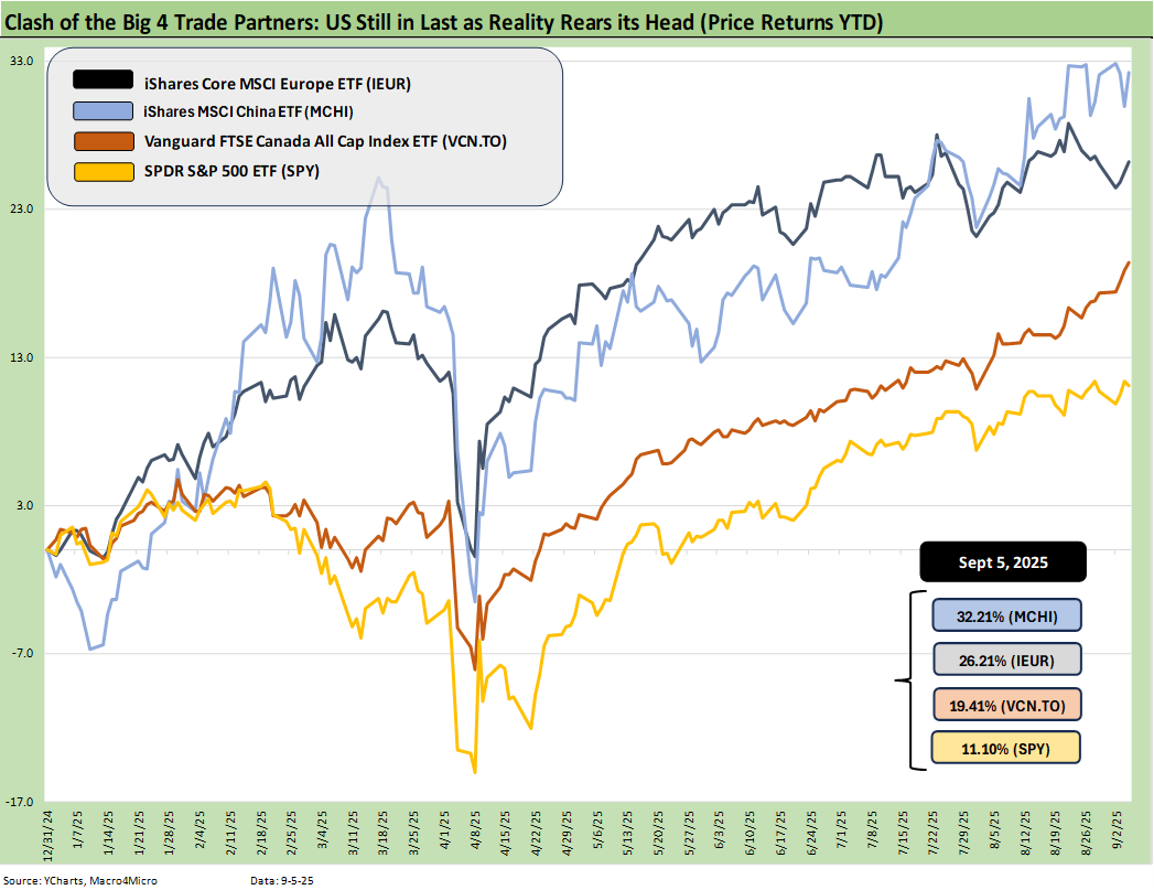 The above updates the YTD returns for some bellwether index ETFs of the Big 4 developed market trading partners – the US, Europe, China, and Canada. The goal is to plot some ETFs that tell a story for US investors thinking about global diversification. The ETFs are just a useful sample that uses relevant broad market indexes for each region as snapshots.
