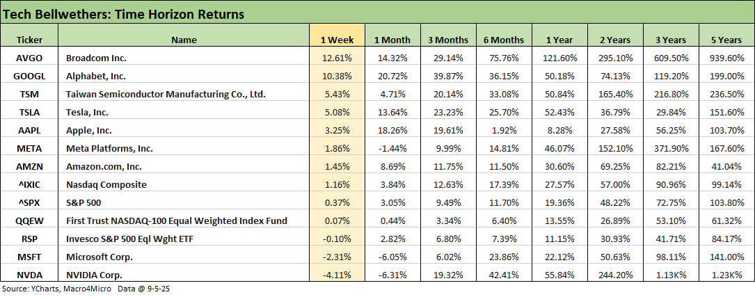 The above chart details the tech bellwether performances with Broadcom (earnings) and Alphabet (favorable antitrust legal decision on chrome divestiture). We see 5 of the Mag 7 (6 of 8 if we go with a “Mag 8” including Broadcom) ahead of the S&P 500. NVDA and MSFT were in the red and brought up the rear.