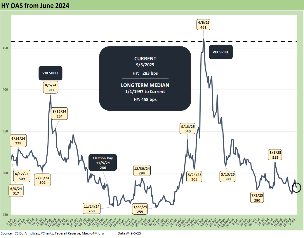 The above chart plots the HY OAS from June 2024, and we see a minimal +1 bps move wider on the week to +283 bps. That HY index OAS is still in the bubble zone of June 2007.
