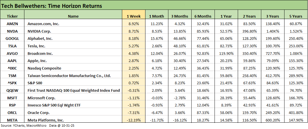 The 11 S&P 500 sectors saw 6 negative, 4 positive and one flat. Extraordinary borrowing for AI infrastructure purposes was a headline in a week when 5 of the Mag 7 printed strong return numbers even if META equity got a Bronx cheer. The material divergence in Hi-Lo numbers in the tech bellwethers came with a 21-point gap between Amazon on top with Meta on the bottom.