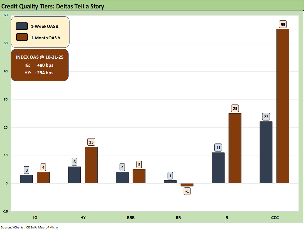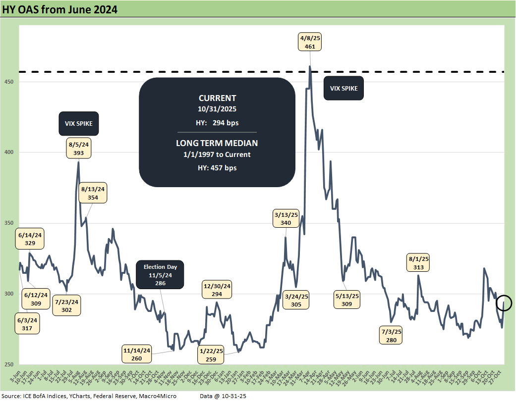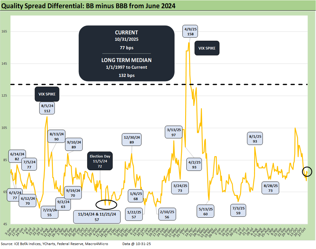 The above chart shows the BB OAS minus BBB OAS quality spread differential moved -3 bps tighter as the BB tier widened by +1 bps and BBB tier widened by +4 bps. The +77 bps is well inside the long-term median of +132 bps but significantly wider than the early 2025 low of +56 bps.