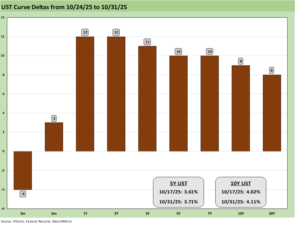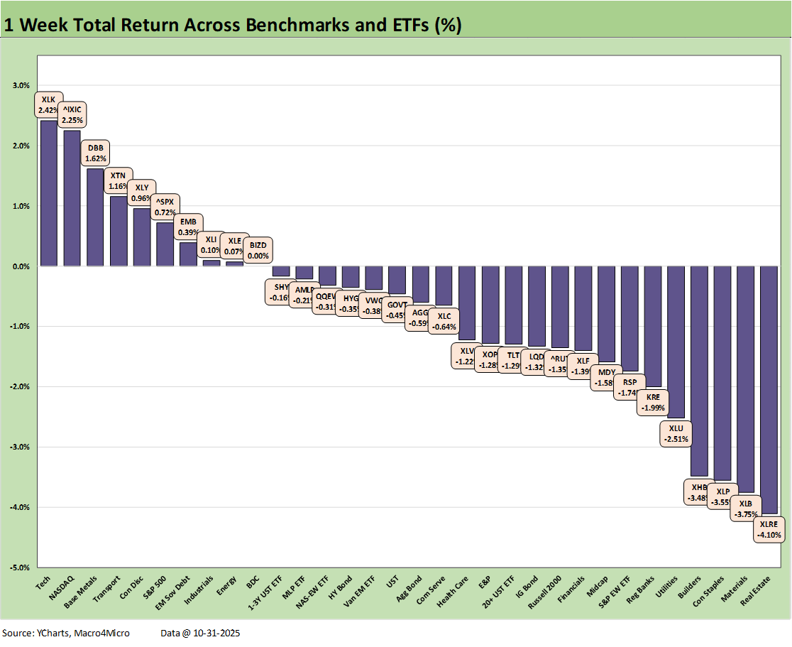 We saw our 32 benchmarks and ETFs weigh in with a positive vs. negative score of 10-32 with an adverse UST shift that sent 6 of 7 bond ETFs into negative range while punishing rate-sensitive ETFs despite the -25 bps FOMC cut. Powell’s more guarded language and at least some higher visibility of a hawkish FOMC minority was running alongside a good 3Q25 earnings quarter. The FedWatch odds of a December cut plunged to 63% from just under 92% 1 week ago.