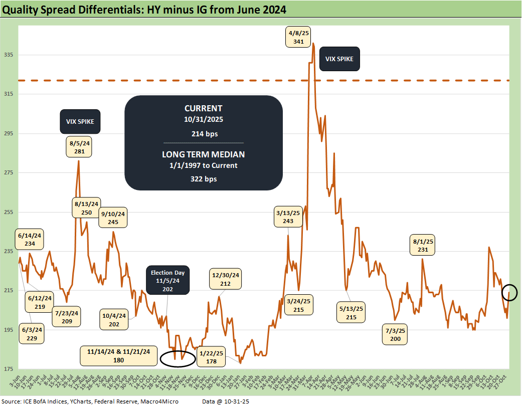 The above chart shows the HY minus IG quality spread differential moving +3 bps wider as HY moved +6 bps wider and IG +3 bps wider. The +214 bps remains notably compressed relative to the +322 bps long-term median.