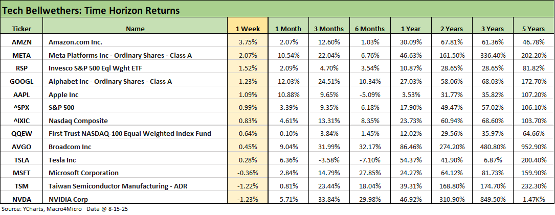 The tech bellwethers are broken out above and lined up in descending order of returns for the week. We see 4 of the Mag 7 ahead of the broad market benchmarks (S&P 500, NASDAQ) and 3 below. NVDA is on the bottom and slightly in the red and Microsoft is also in the red.