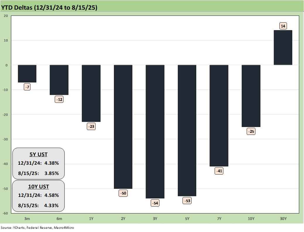 The YTD UST deltas still show a modified bull steepener with the 30Y UST remaining somewhat in its own world as an inflation indicator. As cited earlier, the long duration UST ETF (TLT) was the worst performer in our group of 32 benchmarks and ETFs.