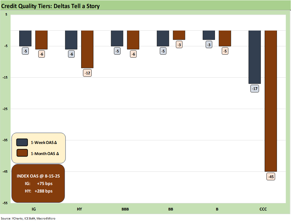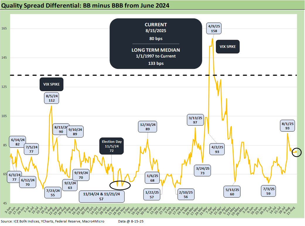 The BB - BBB OAS quality spread differential was unchanged at +80 bps this week as both credit tiers move tighter by -5 bps.