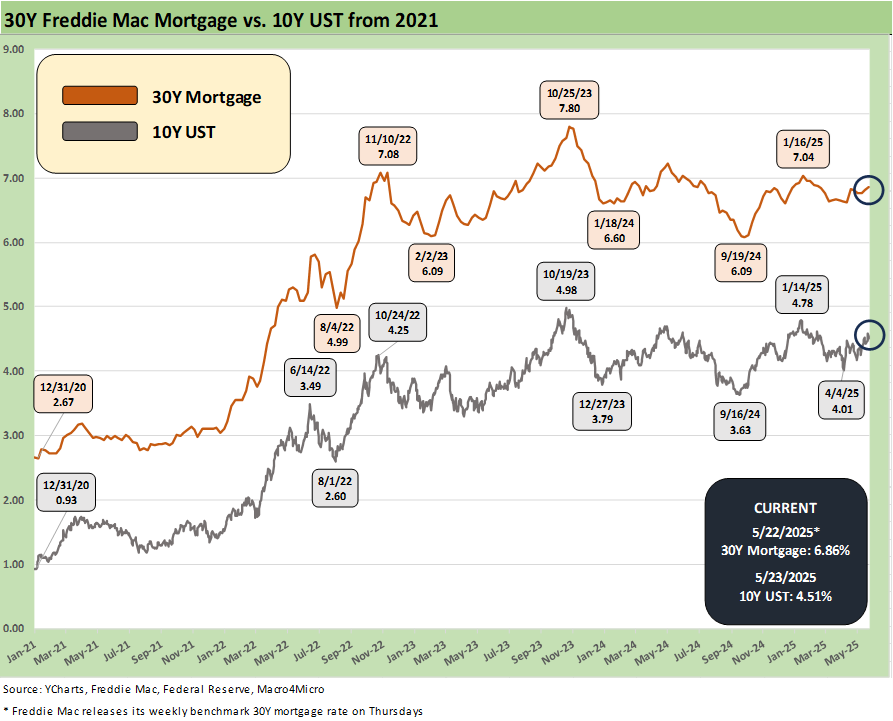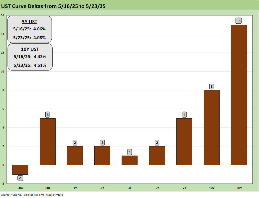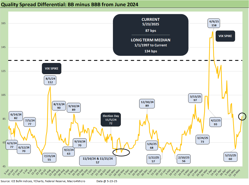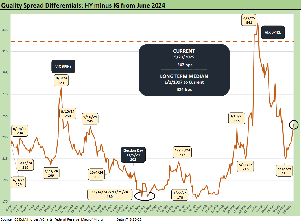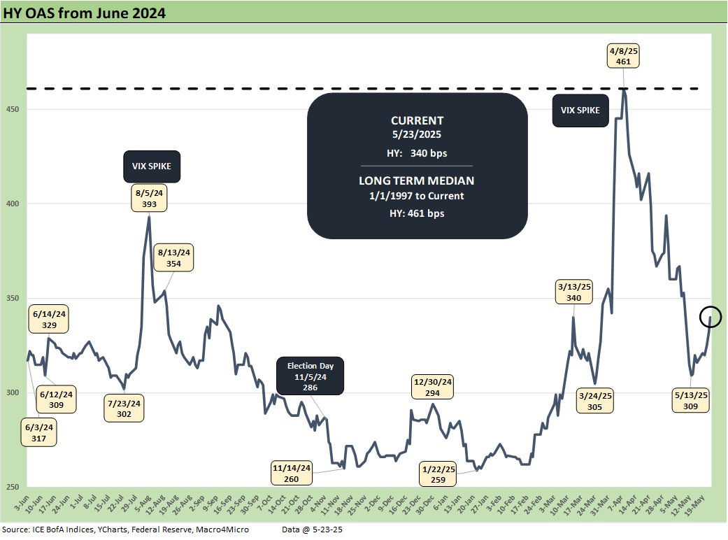 IG spreads held in well and were still in double digits as we will cover in more detail in our separate Footnotes publication on Credit Markets to be published later this weekend. The HY spread widening comes after a move that sent HY OAS back to the cyclical lows of early Oct 2018 (see Footnotes & Flashbacks: Credit Markets 5-19-25).