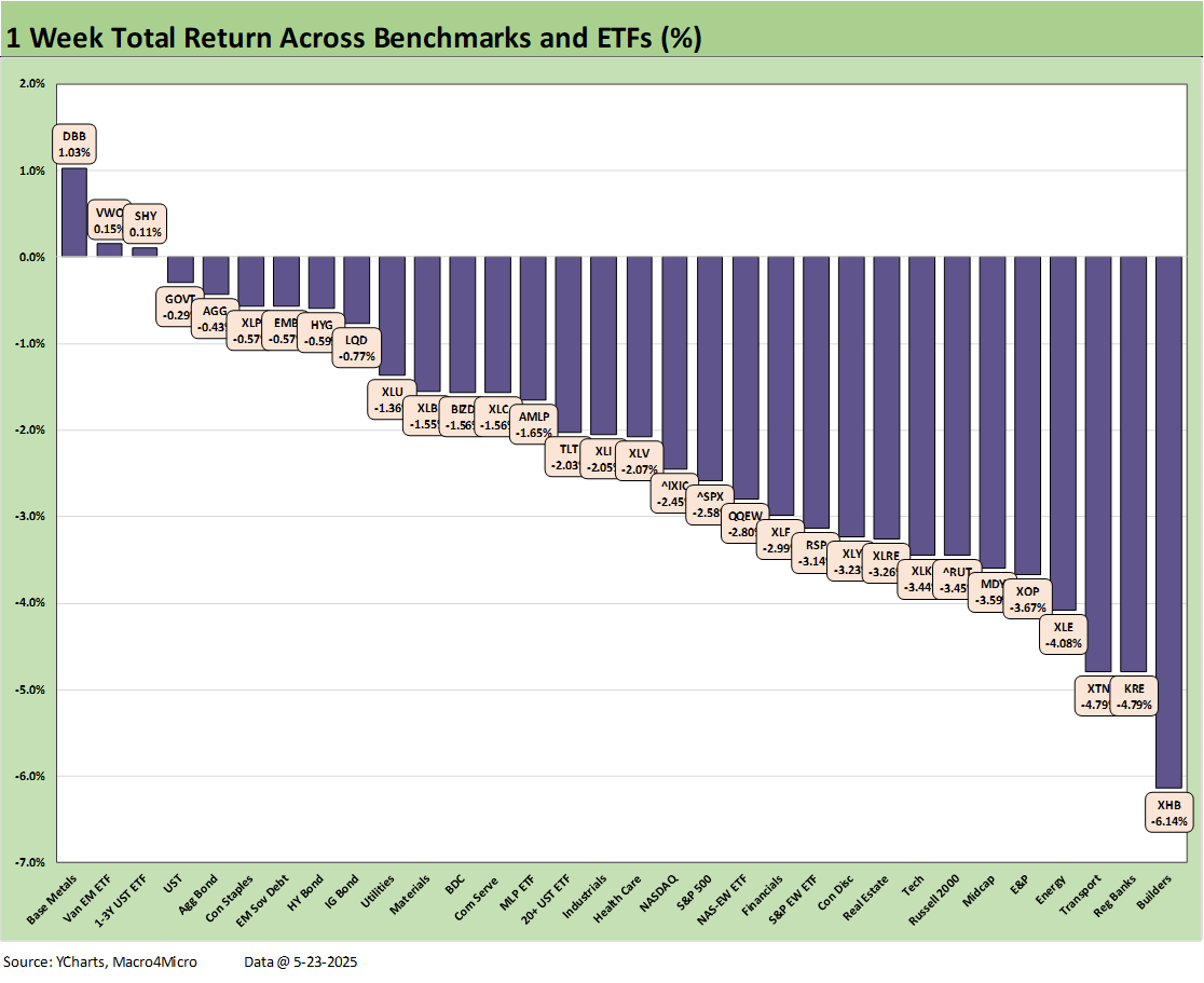 The 1-week return numbers posted a 3-29 score with equities losing, duration losing, and one asset class ETF (base metals) barely crossing 1% for the week. The UST curve was also in disarray with the budget battles and deficit noise sending the 30Y north of 5.0% and the Senate only getting to the House version this coming week.