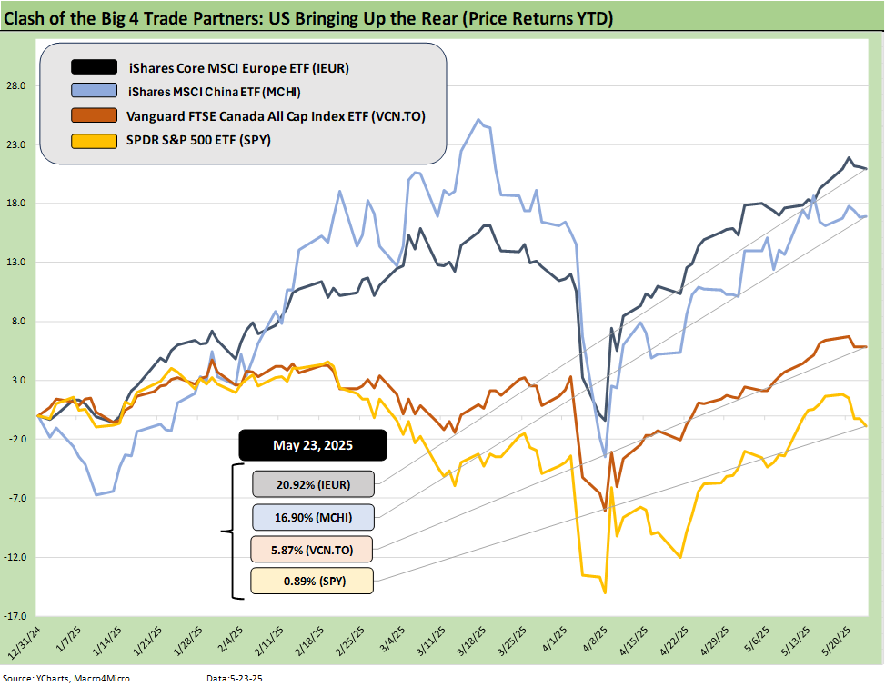 The above chart updates the running YTD return on ETF benchmarks that capture the market view on the battle of the US vs. Europe vs. China vs. Canada. As in recent weeks, the US is pulling up the rear and is back into negative range with Europe and China well ahead. We let the US off easy by using just the S&P 500 index ETF (SPY) since the Midcaps and Small Caps are doing much worse as we cover in the separate Footnotes publication on asset returns. As we head into Memorial Day weekend, the US is running last with a vote of low confidence in the “New Golden Age.”