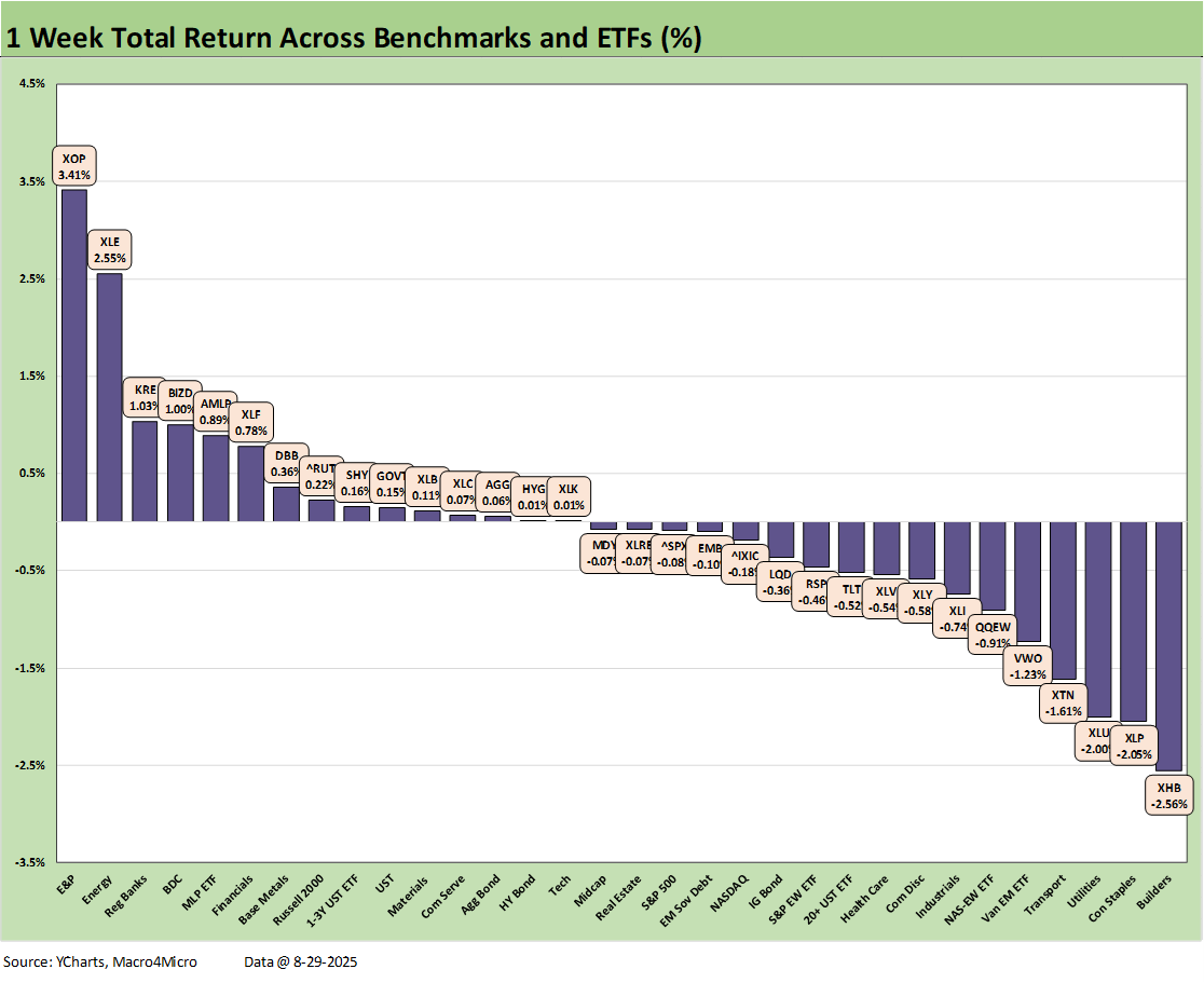 The mixed performance of duration this week did not help the builders or other interest sensitive sectors such as Real Estate (XLRE) or Utilities (XLU). We see the long duration UST ETF (TLT) in the red near the bottom of the third quartile. There will be a lot of UST slope and shapeshifting debates in September as the FOMC eases and a fresh mix of payroll, inflation, consumer, housing, and industrial data get released.