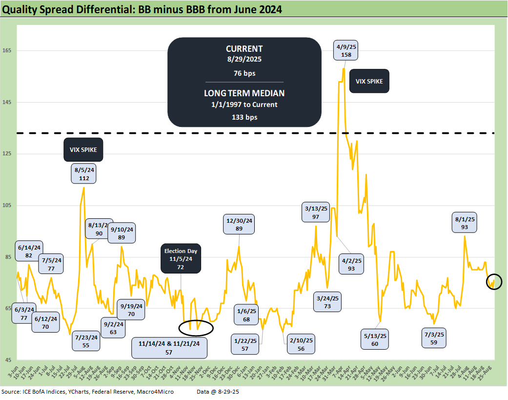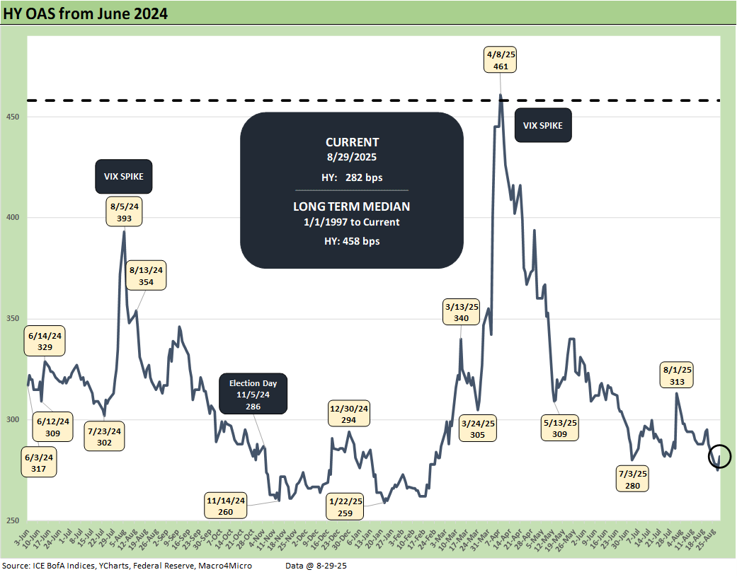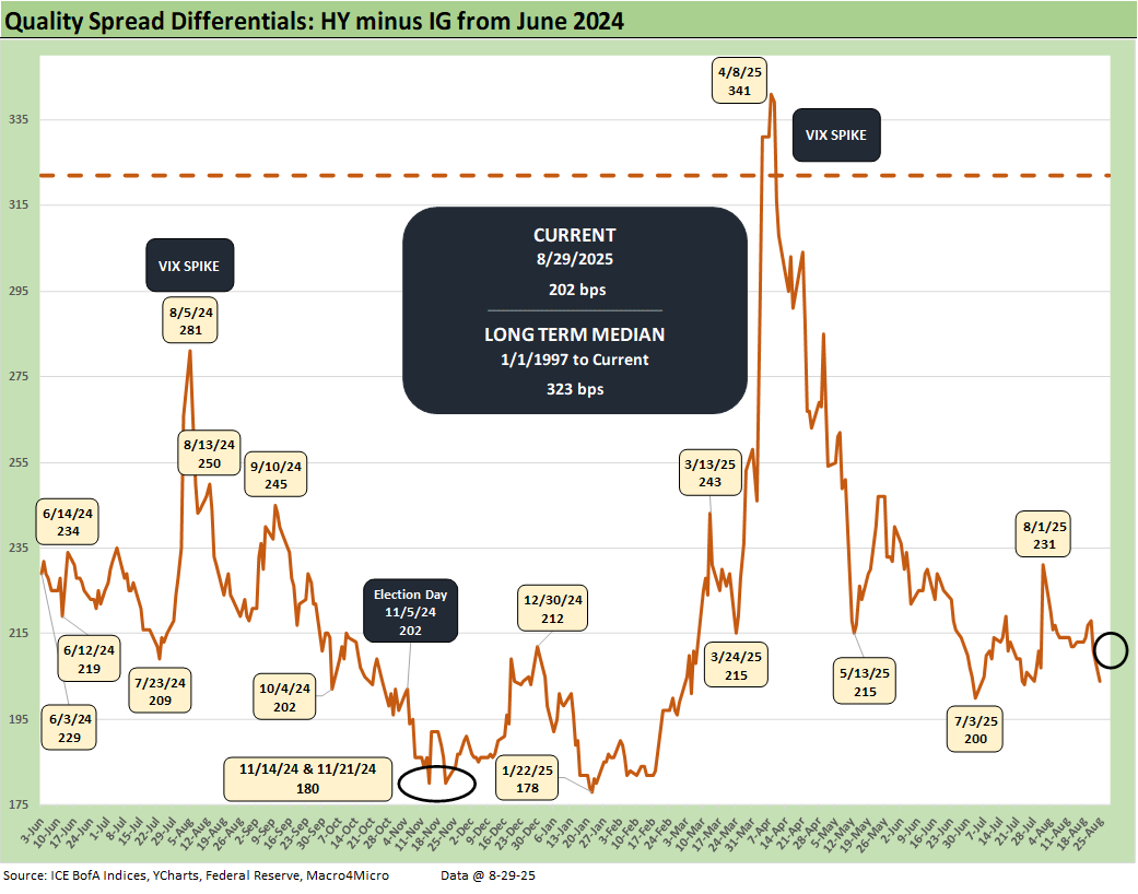The “HY minus IG OAS” quality spreads tightened to +202 bps from +211 bps as HY tightened. IG OAS edged wider by +3 bps with HY tighter by -6 bps.