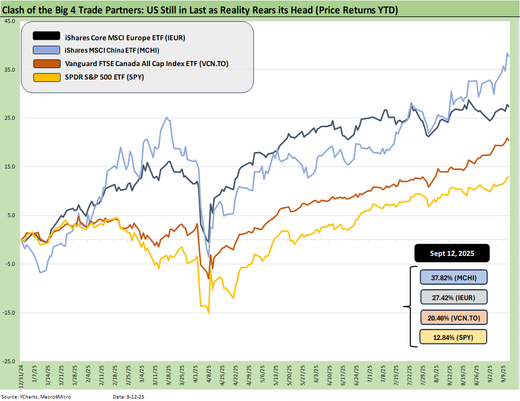 The above updates the YTD returns for some bellwether index ETFs for the Big 4 developed market trading partners – the US, Europe, China, and Canada. The aim is to plot some ETFs that tell a story for US investors thinking about global diversification. These ETFs are just a useful sample that uses relevant broad market indexes for each region as snapshots.