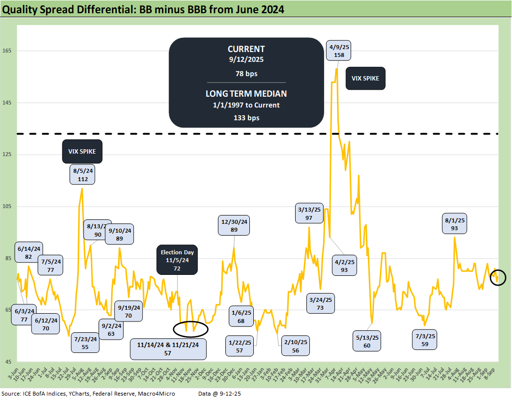 The above chart shows the “BB OAS minus BBB OAS” quality spread differential tightened by -1bps to +78 bps over the week with the BB tier -4 bps tighter and the BBB tier -3 bps tighter. The BBB vs. BB OAS differential remains wide to the early July level around +59 bps and +56 bps in Feb 2025.