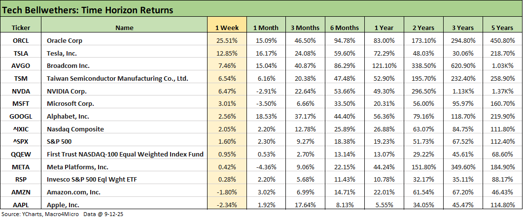 The above chart updates the tech bellwethers with Oracle being the story of the week after their earnings report and related details. We added ORCL to this table as of this week. The +25% week for ORCL is dazzling for a company now in the Top 10 S&P 500 rankings for market caps.