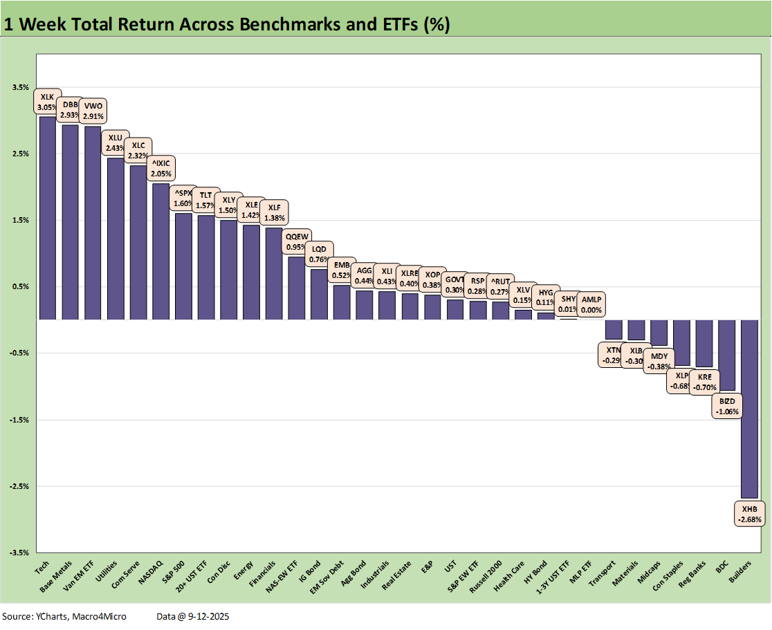 The past week saw a 25-7 score on positive vs. negative returns for the 32 benchmarks and ETFs we track. All bond ETFs were positive, and the long duration UST ETF (TLT) made it into the top quartile alongside the NASDAQ and S&P 500. The small cap Russell 2000 faded into the third quartile and Midcaps ended up in the bottom quartile. The 11 S&P 500 sectors saw 9 positive, 1 negative and 1 flat (0%).