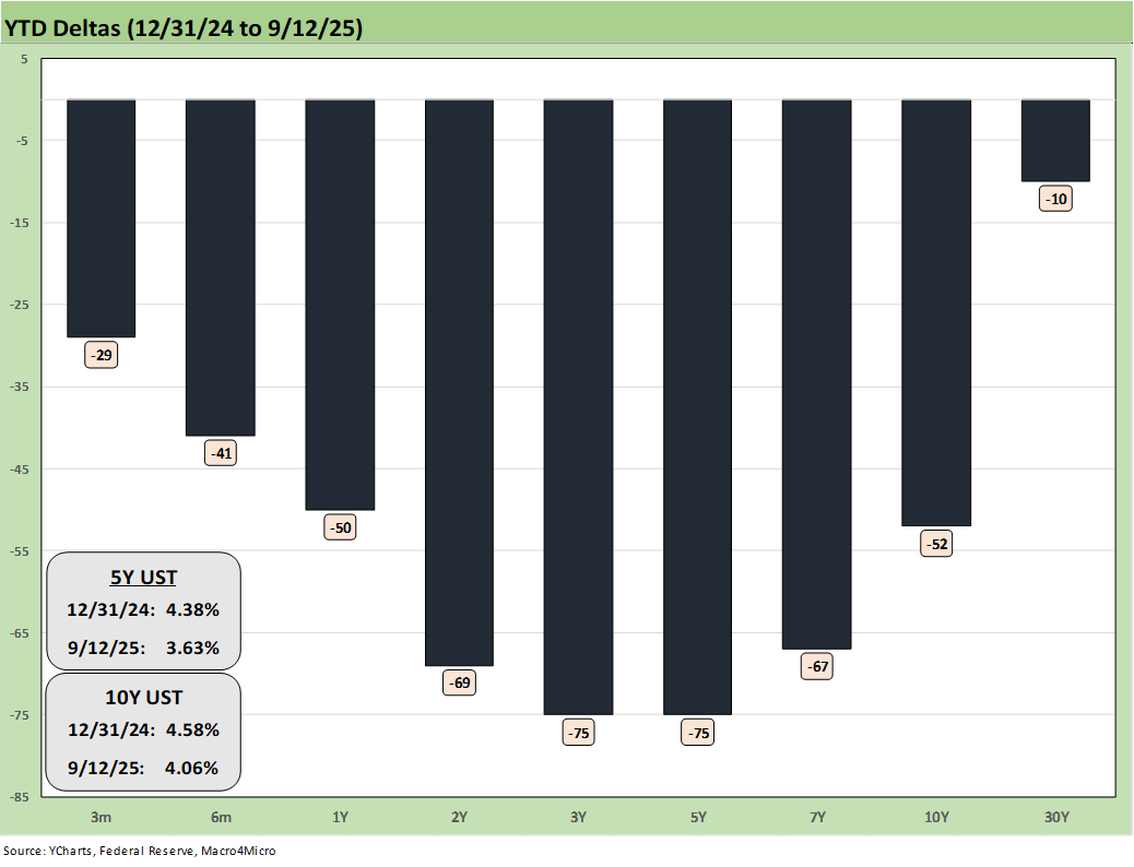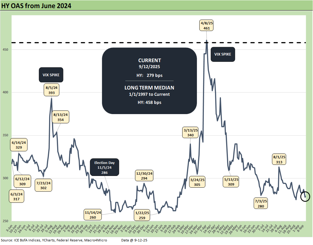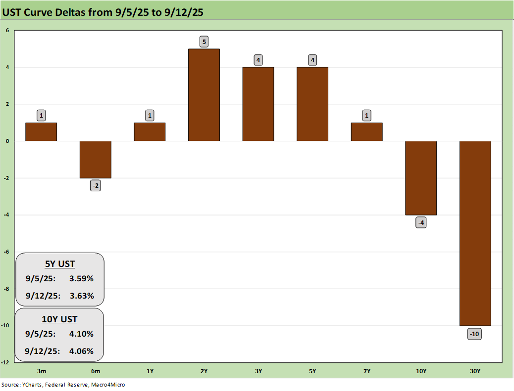 Credit spread moves were very mild and biased tighter while the UST handicapping now overwhelmingly favors -25 bps in Sept, Oct, and Dec. Employment seems to be taking over the front burner in the FOMC kitchen. That said, inflation and tariffs (SCOTUS IEEPA appeal) remain critical to the UST curve shapeshifting risk and revisiting a potential steepener of the sort seen after the Sept 2024 easing and 100 bps across Sept to Dec of 2024.