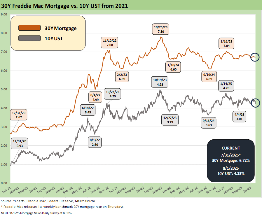 The wave of critical economic releases and events of the past week (the Aug 1 tariff date, PCE inflation, income and outlays data, payroll/JOLTS, 2Q25 GDP advance estimate, FOMC release) joined with a very broad array of earnings releases and guidance to – on balance – tell a story of a weakening economy, inflation creep by product bucket, and weaker corporate sector investment as reflected in the GDP data. It was all too much for Trump as he lashed out at “rigged” data (see Employment July 2025: Negative Revisions Make a Statement 8-1-25, PCE June 2025: Prices, Income, and Outlays 7-31-25, 2Q25 GDP: First Cut of Another Distorted Quarter 7-30-25).