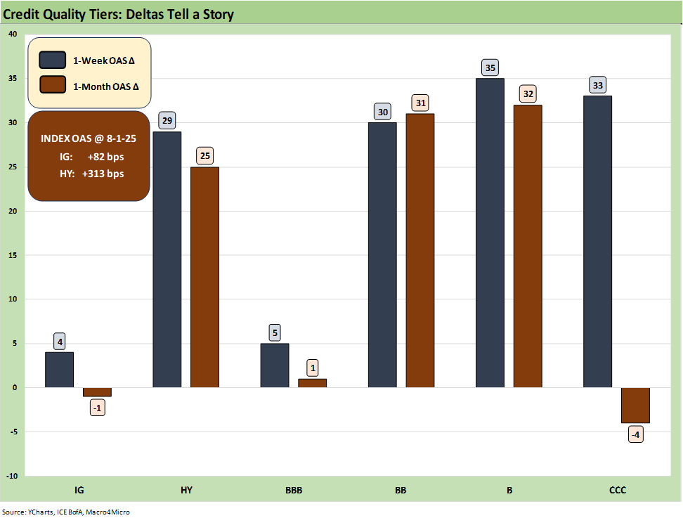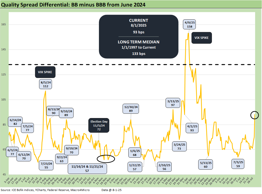 The BB OAS minus the BBB OAS quality spread differential is +25 bps wider to +93 bps as the BB tier gapped wider by +30 bps on the week and BBBs only moved +5 bps wider.