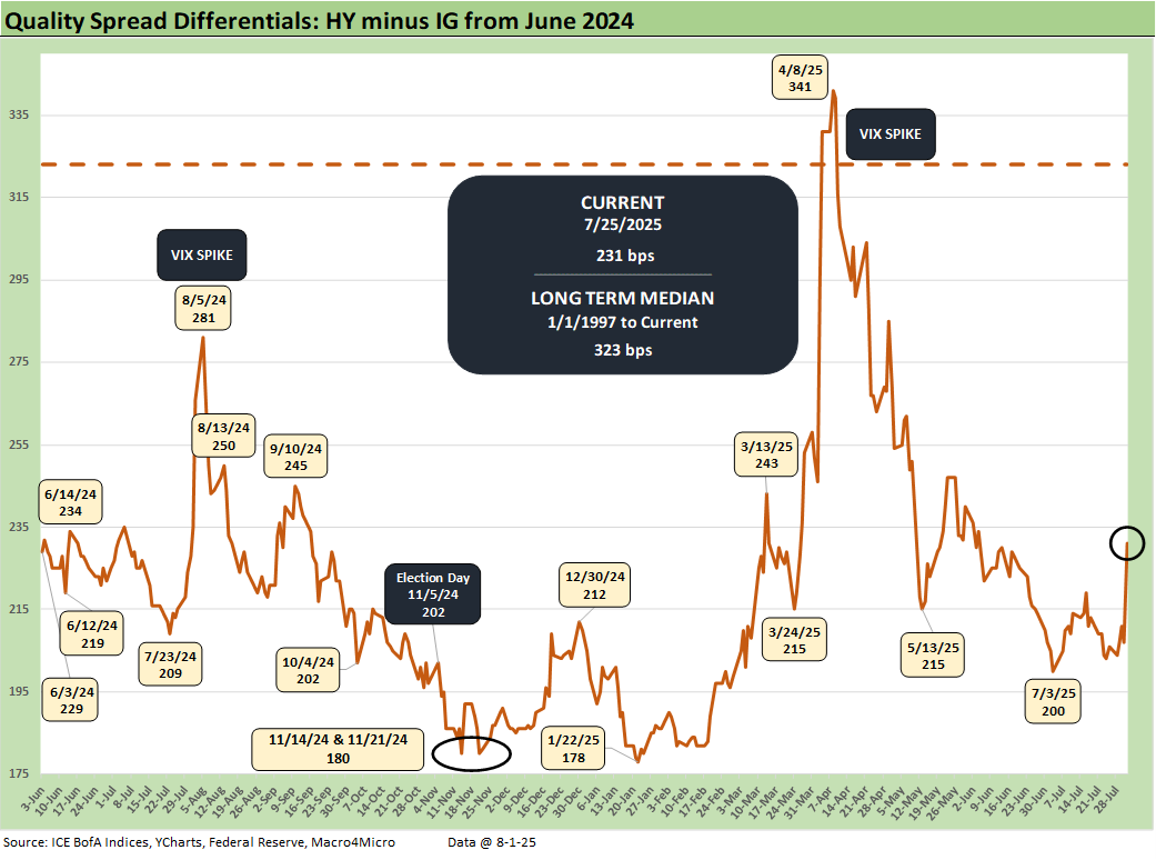 The “HY OAS minus IG OAS” quality spread differential moved +25 bps wider this week as quality spreads react to data and headlines from the bottom up. The +231 bps is still very compressed to the +323 bps long-term median and +53 bps above the Jan 2025 lows.