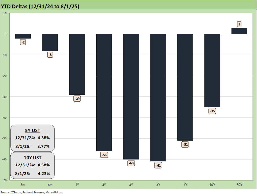 The YTD UST deltas still show the bull steepener trend that has supported short to intermediate debt with the 30Y now only slightly higher at +3 bps after the week’s UST rally.