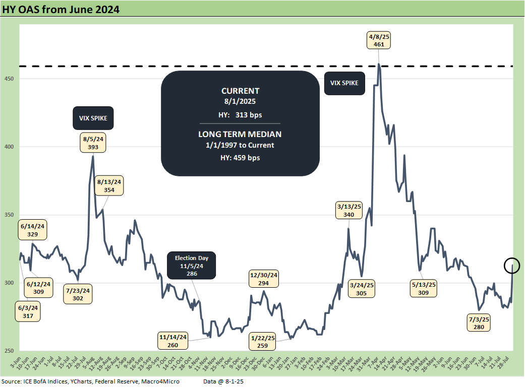 The above chart updates the HY OAS with spreads +29 bps wider to +313 bps. That is +54 bps off the Jan 2025 lows. YTD HY OAS is +21 bps wider.