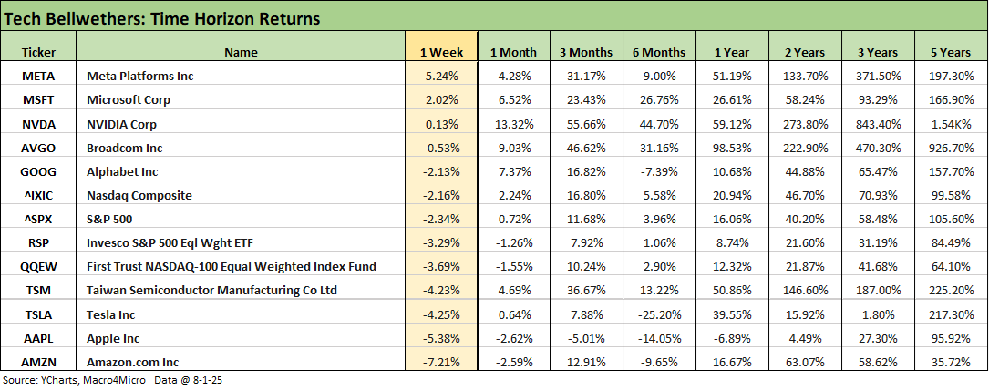 The tech bellwethers in the above chart show a soft week even in the face of some very solid quarterly earnings reports (notably META, MSFT). Only NVIDIA, Microsoft, and Meta posted positive return weeks. We see the bottom 3 slots held by Mag 7 members (AMZN, AAPL, TSLA) to go with 3 Mag 7 on top and Alphabet at #5.