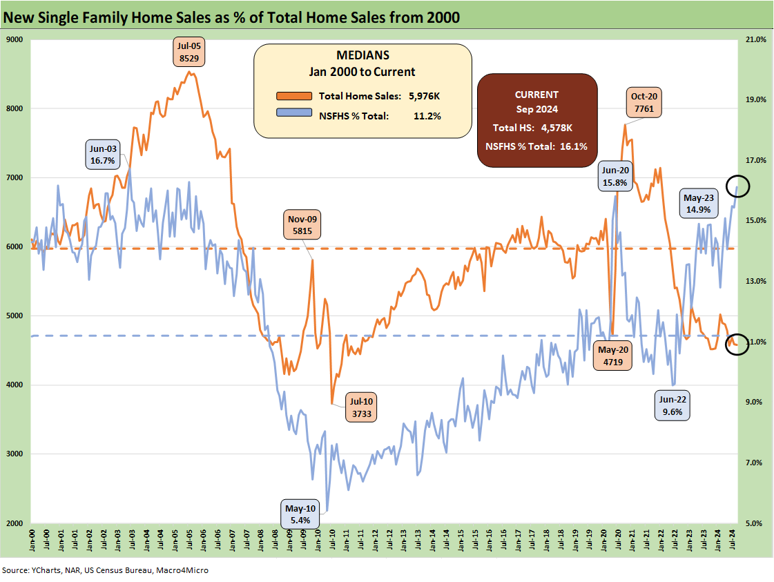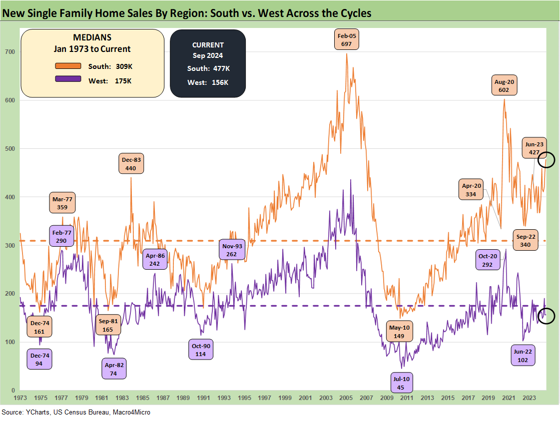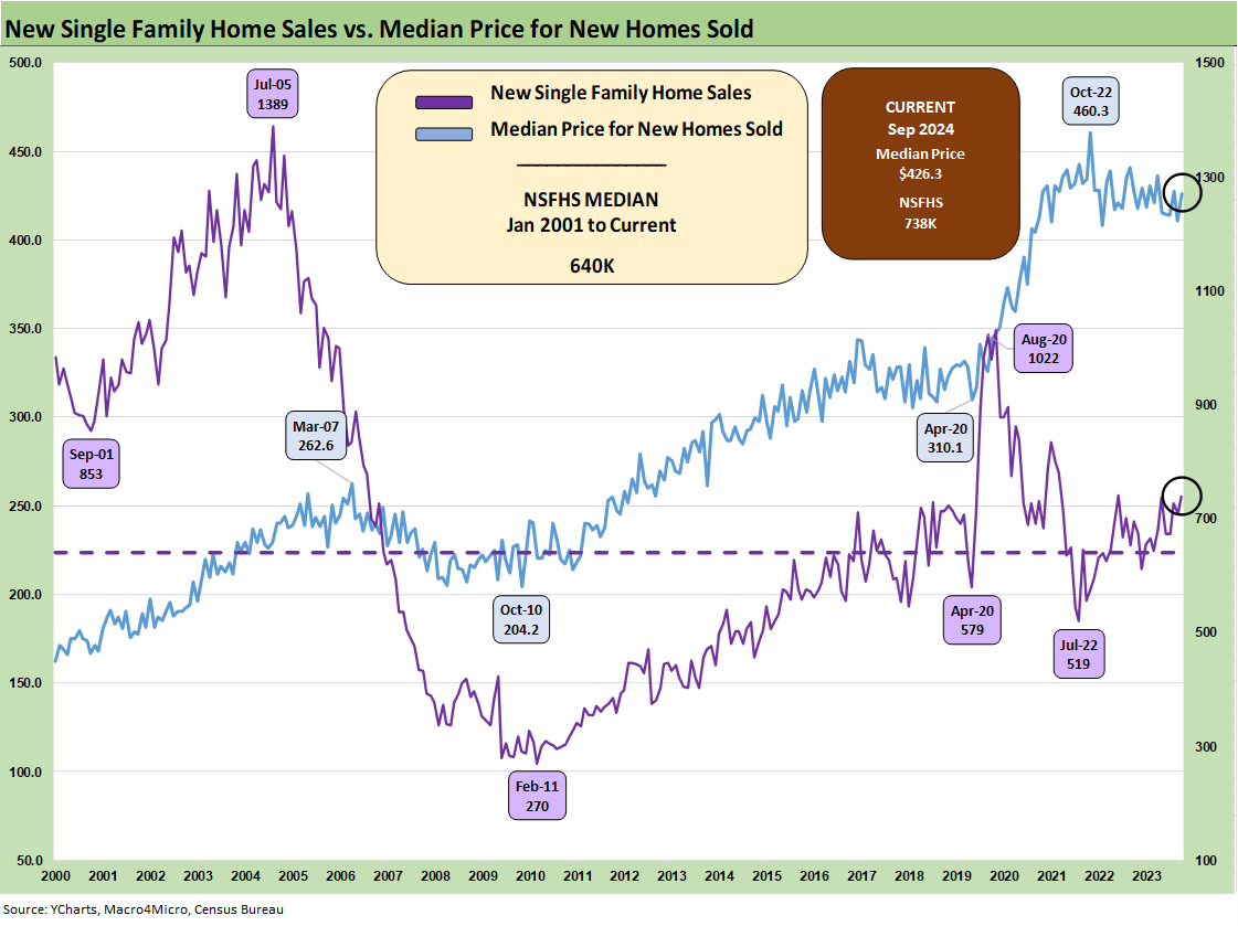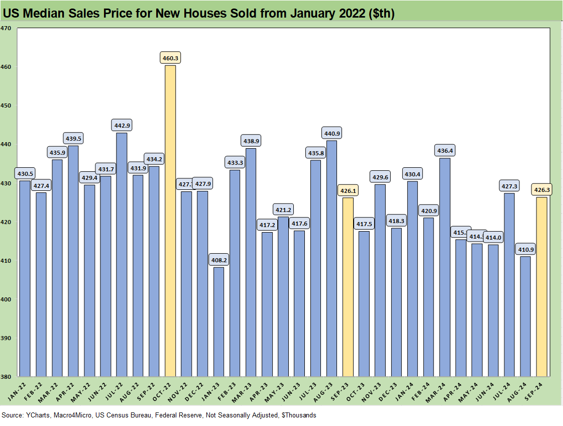 The +4.1% sequential rise in new single family home sales for Sept and +6.3% YoY saw sequential median home prices popping to $426.3K in Sept 2024 from $410.9K in Aug 2024 and essentially flat YoY vs. $426.1K in Sept 2023.