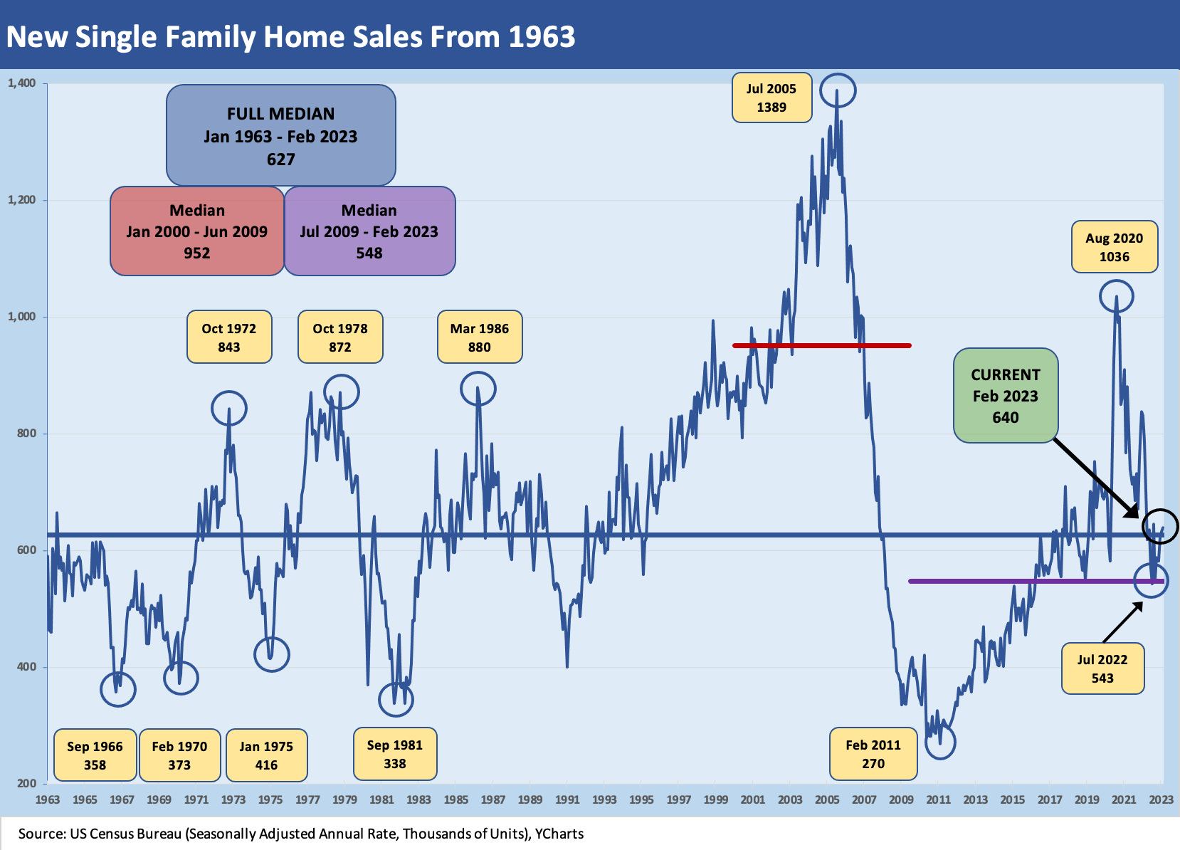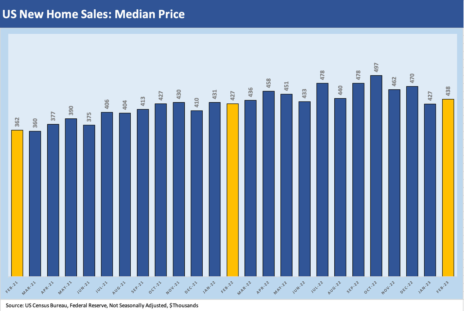 The median price detailed in the new home sales report always comes with the asterisk around product mix, price tier, and regional mix shifts. The $438.2K median is up sequentially from Jan 2023 but below the July 2022 to Dec 2022 price levels. In terms of geographic mix, we already cited the rise of +8.1% in the West and a +3.0% increase from Jan 2023 in the South, which is by far the largest region. Those stats are on a seasonally adjusted basis. The West is a high price region.
