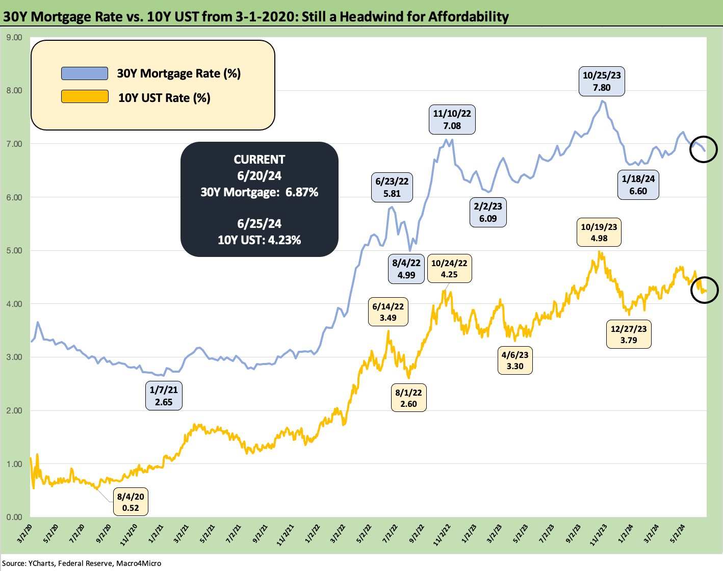 As we have covered along the way in our research on housing and rates, the homebuilders had impressively pushed right through the monthly payment shocks with major builder equities and ETFs (XHB) generating the best returns among the 32 benchmarks and ETFs we follow each week. The XHB only recently fell out of the #1 slot for the running LTM (see Footnotes & Flashbacks: Asset Returns 6-23-24).
