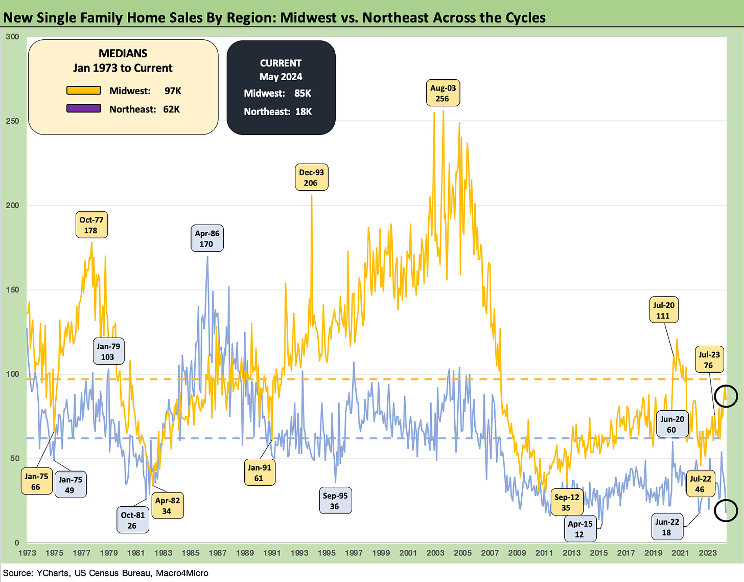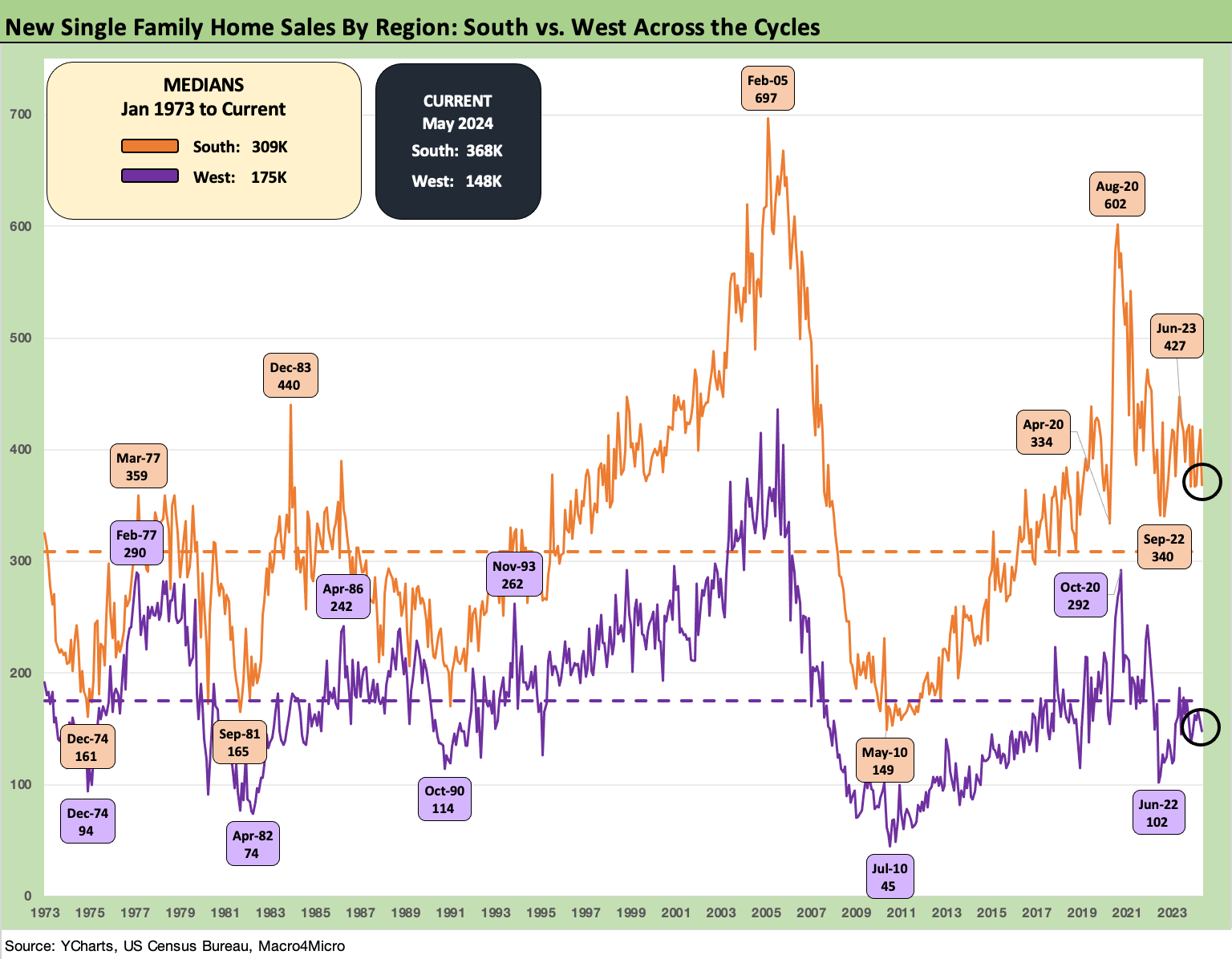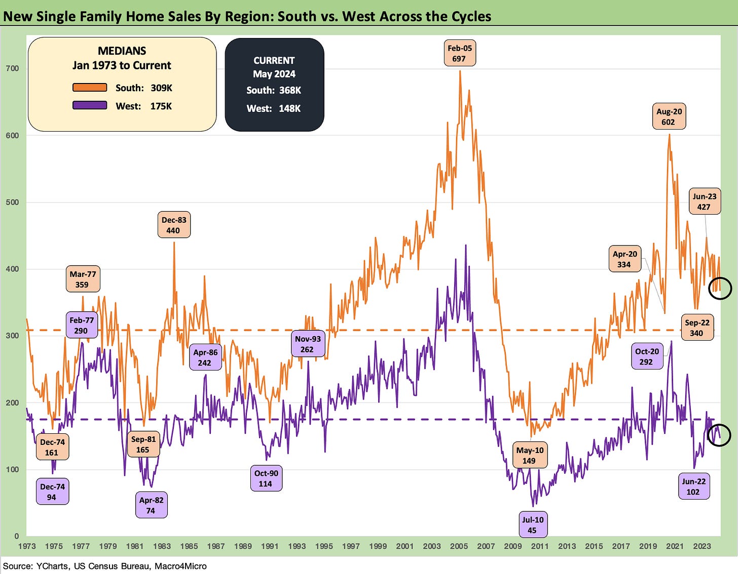 The above chart frames up the new home sales history across the two largest regions, the South and the West. We also include the longer-term medians in the box in the upper left. We see the South running ahead of the median and the West below it.