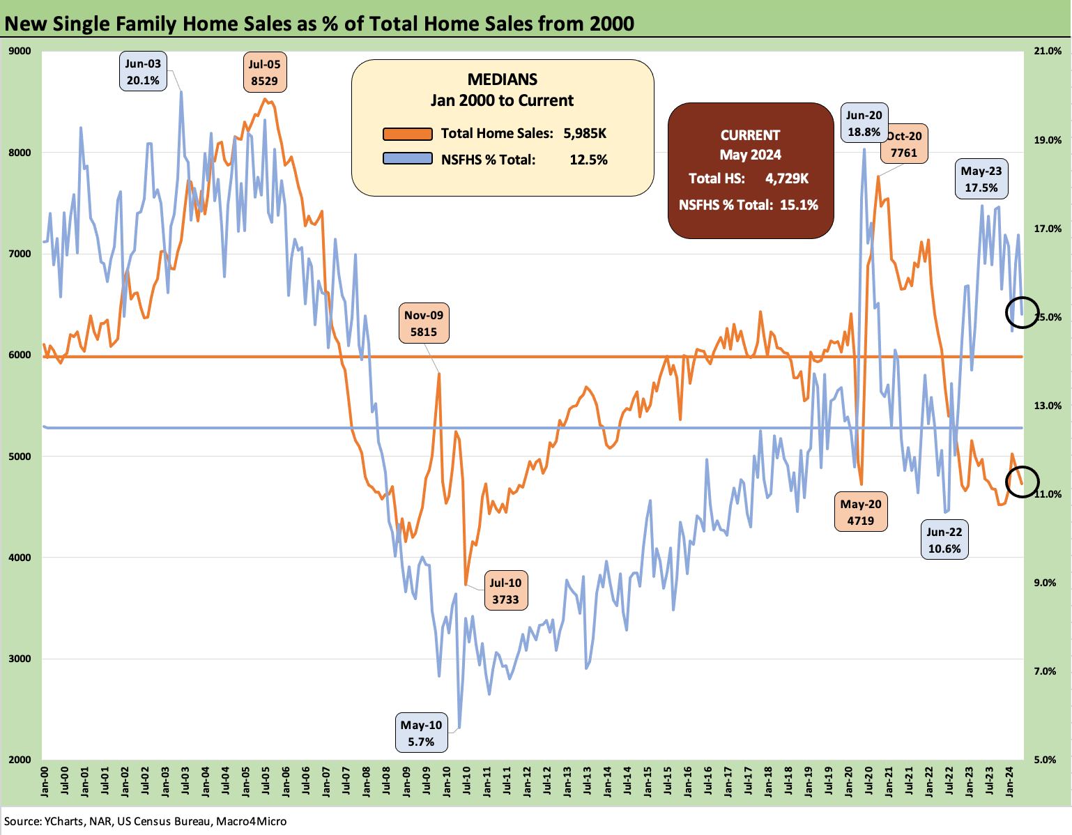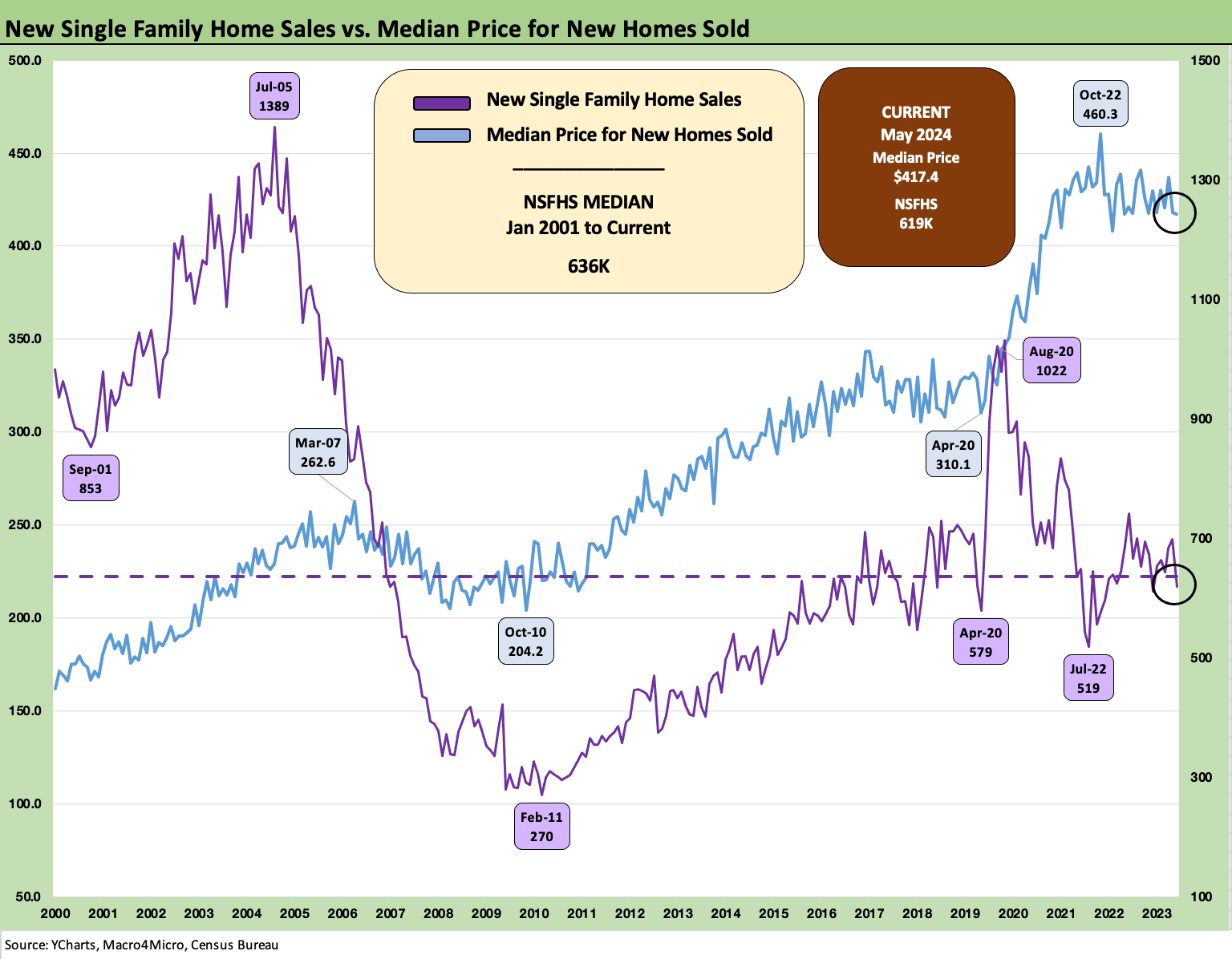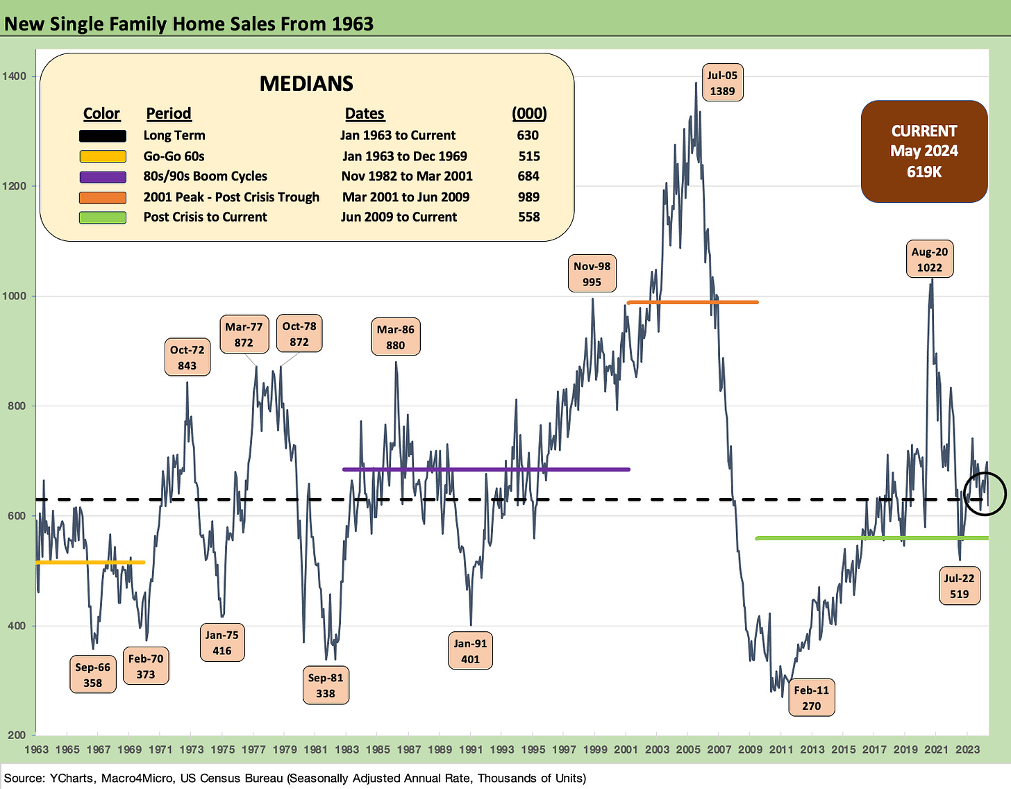The above chart updates the long-term time series single family new home sales. We see current levels now below the long-term median from 1963 despite the greater demographic demands today. May 2024 new single family home sales only exceeds the post-crisis median after the housing bubble burst and mortgage credit collapsed along with a range of regional valuations for some years.