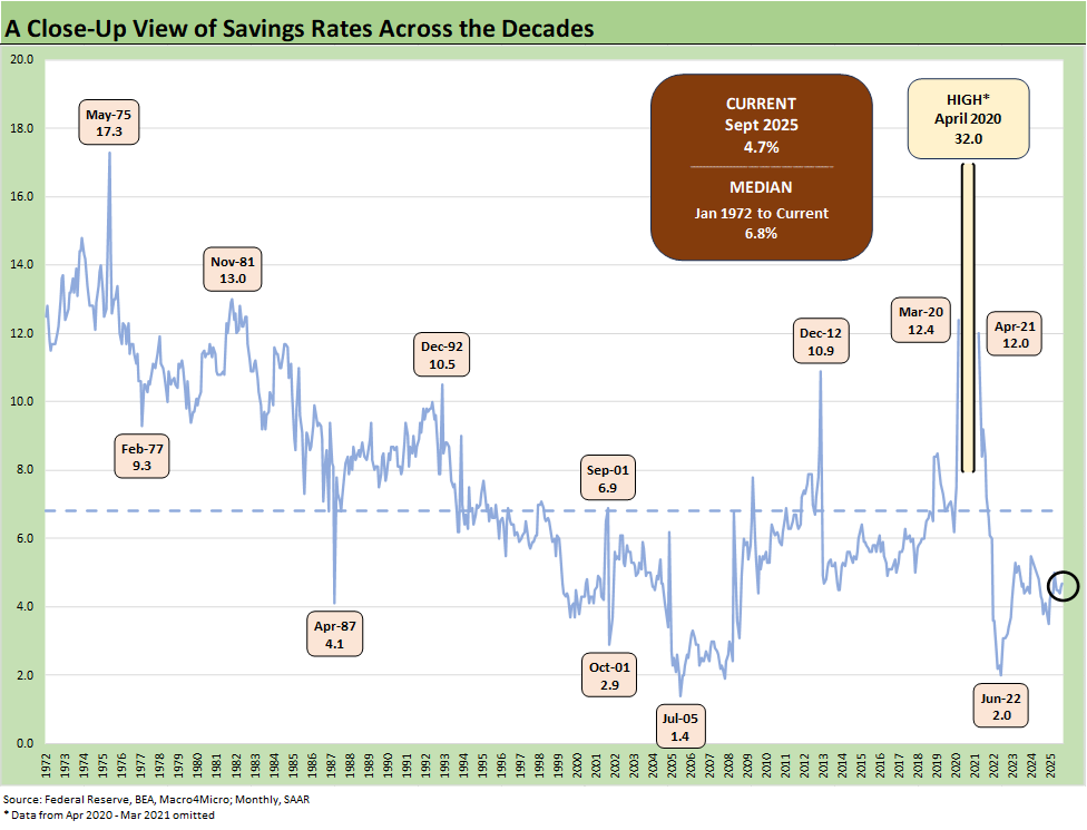The above chart updates the savings rate history with the latest number flat MoM at 4.7% after a 2025 peak in April of 5.7% (as revised). We have looked at the savings rate dynamics in earlier commentaries (see Savings Rates: Context Across the Cycles 10-27-23). Savings rates peak in times of worry (occasionally panic) as evident in the chart above. As of now, households are clearly spending even if some more come to regret it when credit card bills come due.