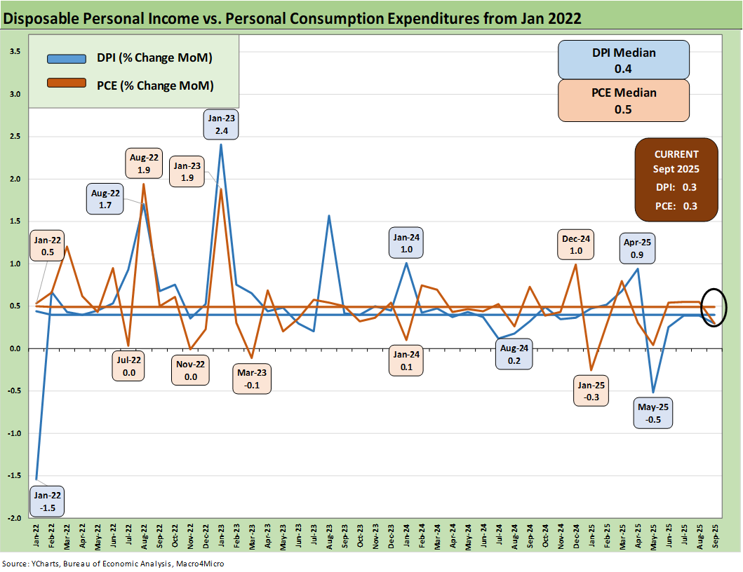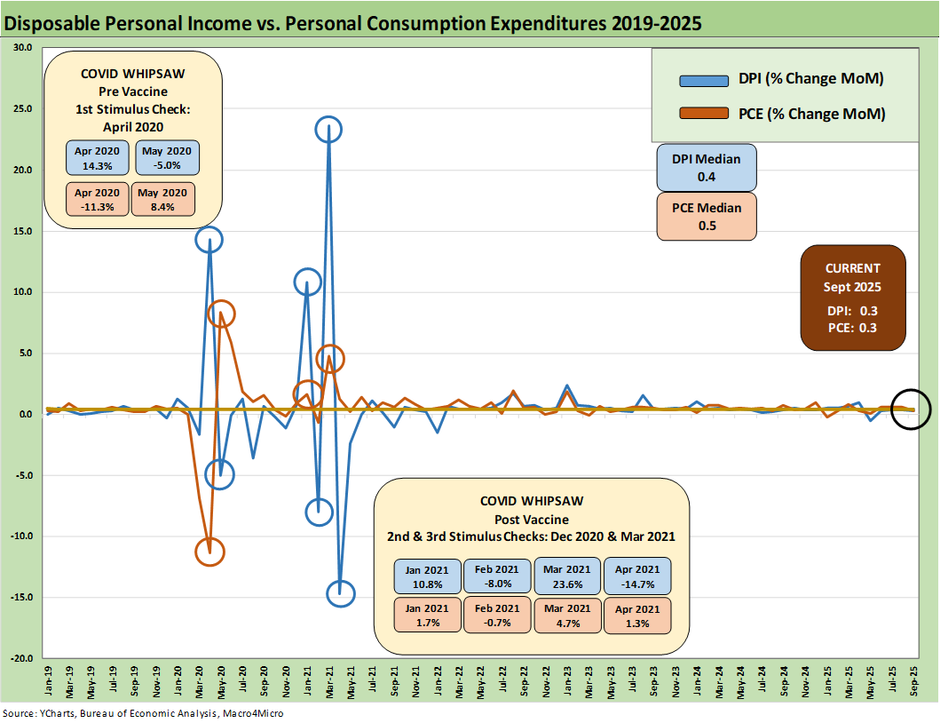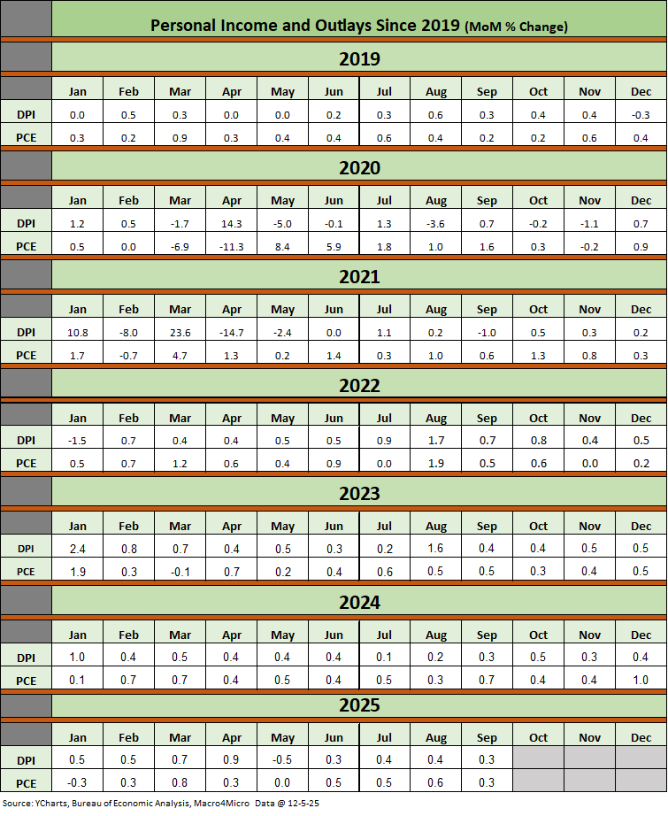 The above table plots the monthly Disposable Personal Income MoM change numbers vs. the Personal Consumption Expenditure MoM numbers across the years from 2019 through July 2025. It is an easy scan across key time periods for a look at turning points in DPI (e.g. stimulus payments) or PCE.