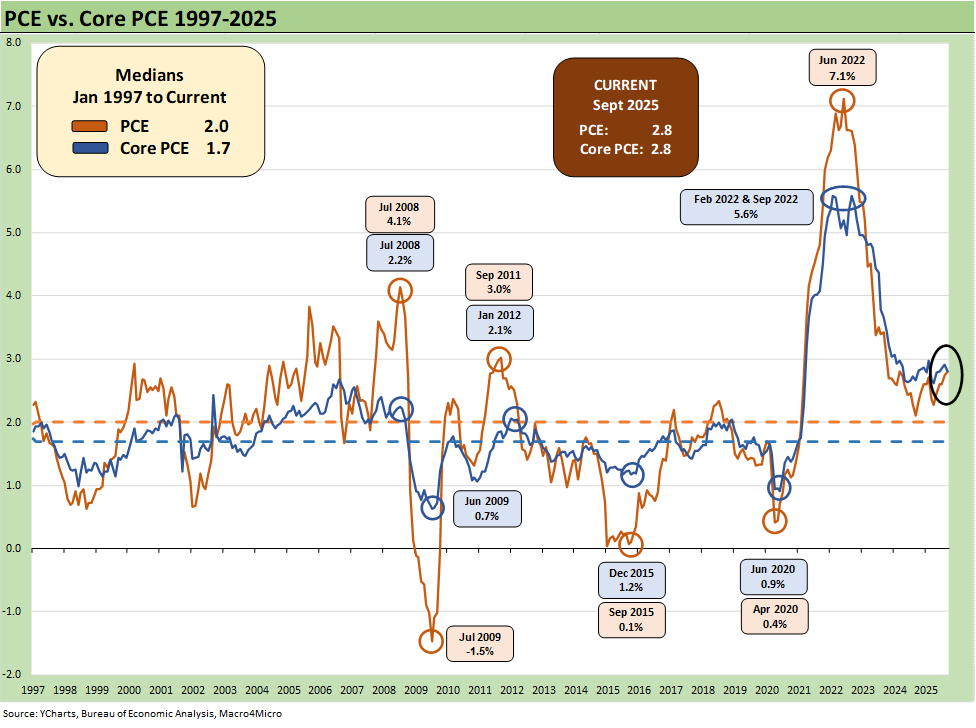 The Sept 2025 PCE numbers are at reasonable levels in long-term context, but they are in somewhat of a stall with numerous key lines going in the wrong direction. The SEP 2024 report and dot plot kept the PCE inflation forecast for 2025 unchanged from June at 3.0% headline and 3.1% core. We still have 3 months to go for reported numbers (Oct, Nov, Dec). It will be very interesting to see how the Fed SEP report and ensuing commentary address these forecasts during a period of very limited economic releases with the shutdown fallout.