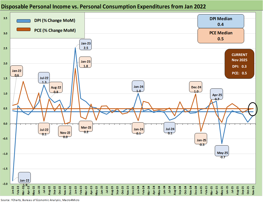 The line items can sometimes show some volatility. We like to look for gaps between DPI and PCE and moves in Personal Savings. PCE growth has outpaced DPI since spring 2025. As of Nov 2025 we see PCE growth higher than DPI for 7 straight months. That came after 3 of the first 4 months of 2025 saw DPI ahead of PCE.