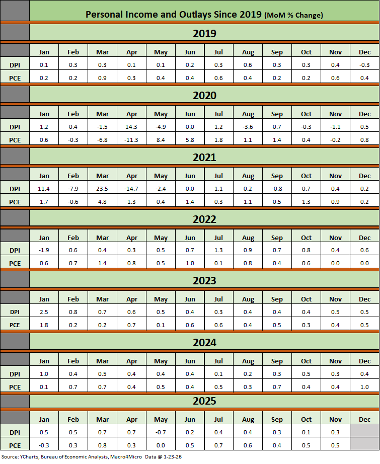 The above table plots the monthly Disposable Personal Income MoM change numbers vs. the Personal Consumption Expenditure MoM numbers across the years from 2019 through Nov 2025. It is an easy scan across key time periods for a look at turning points in DPI (e.g. stimulus payments) or PCE. Table 1 in the monthly PCE release shows total dollar amounts on each line.
